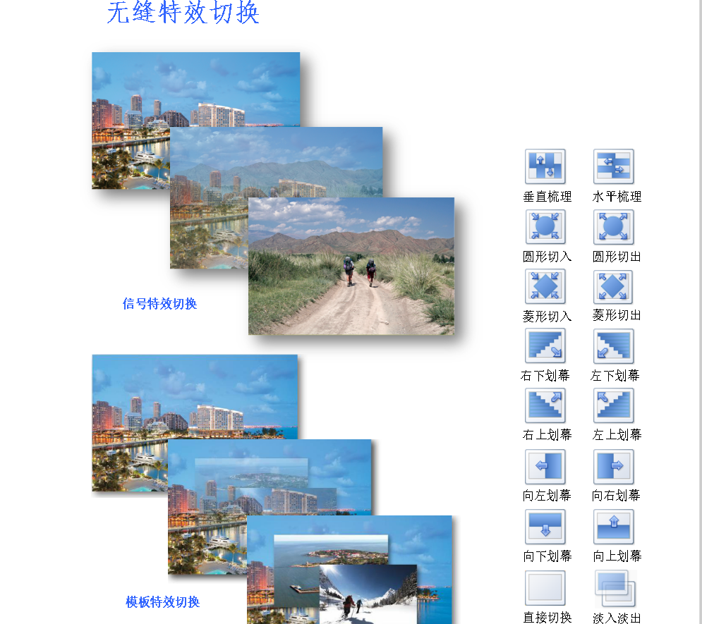 特效切換 | ·信號及模式切換時,用戶可選擇不同的特效,包括:淡入淡出,無縫直切,垂直、水平梳理,圓形切入、切出,菱形切入、切出,各個方向的劃幕 |