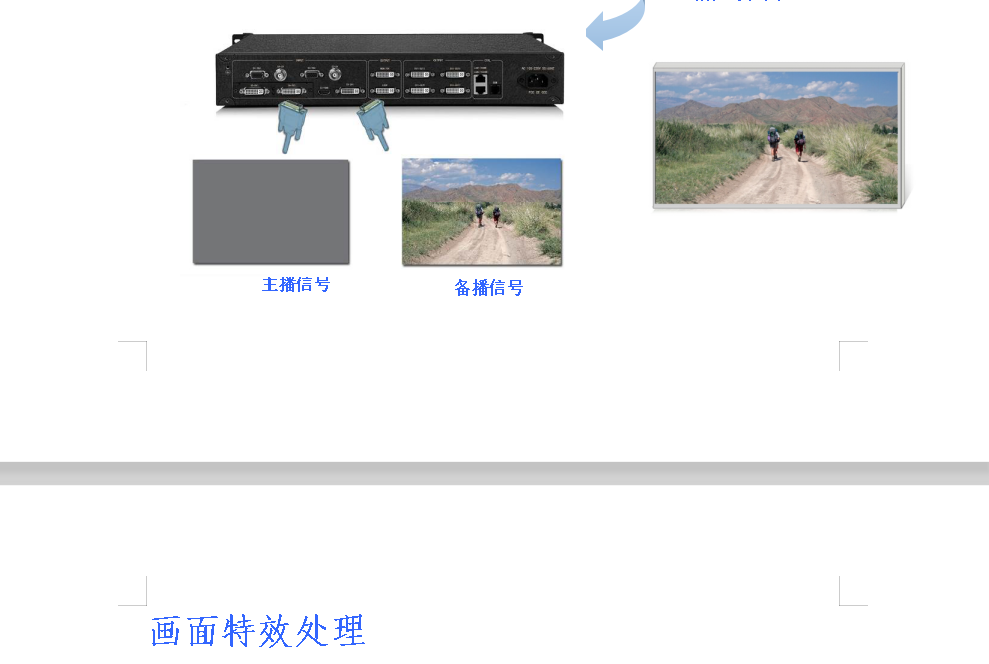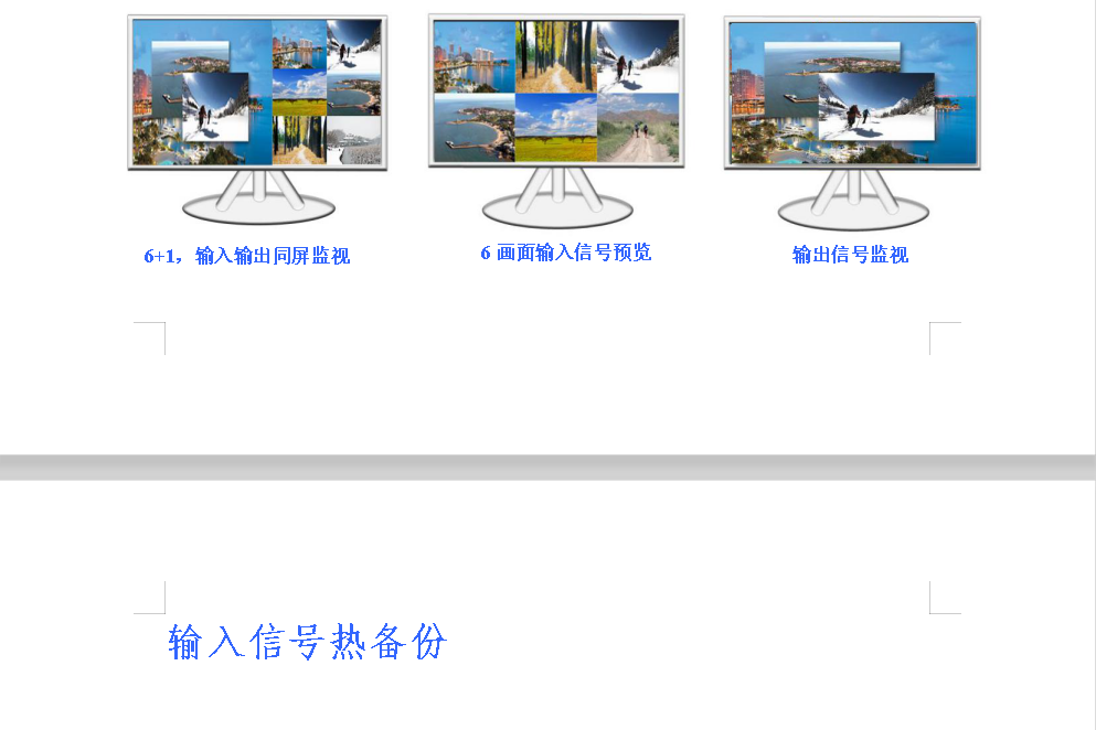 6+1畫面預覽和監(jiān)視 | ·用戶可以通過監(jiān)視器同時預覽6路輸入信號,并可以同時監(jiān)視當前的輸出畫面 |