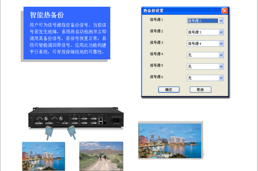 熱備份功能 | ·用戶可對輸入信號指定備份信號,當前信號故障時,系統(tǒng)自動輸出備份信號,當信號恢復時可自動跳回 |