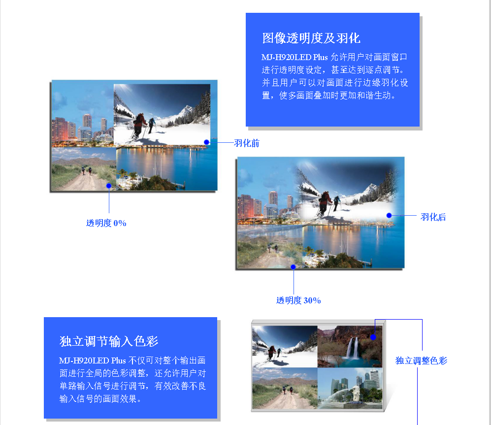 畫面透明度設(shè)置 | ·每個畫面的透明度可單獨調(diào)節(jié),0~100%可調(diào) |