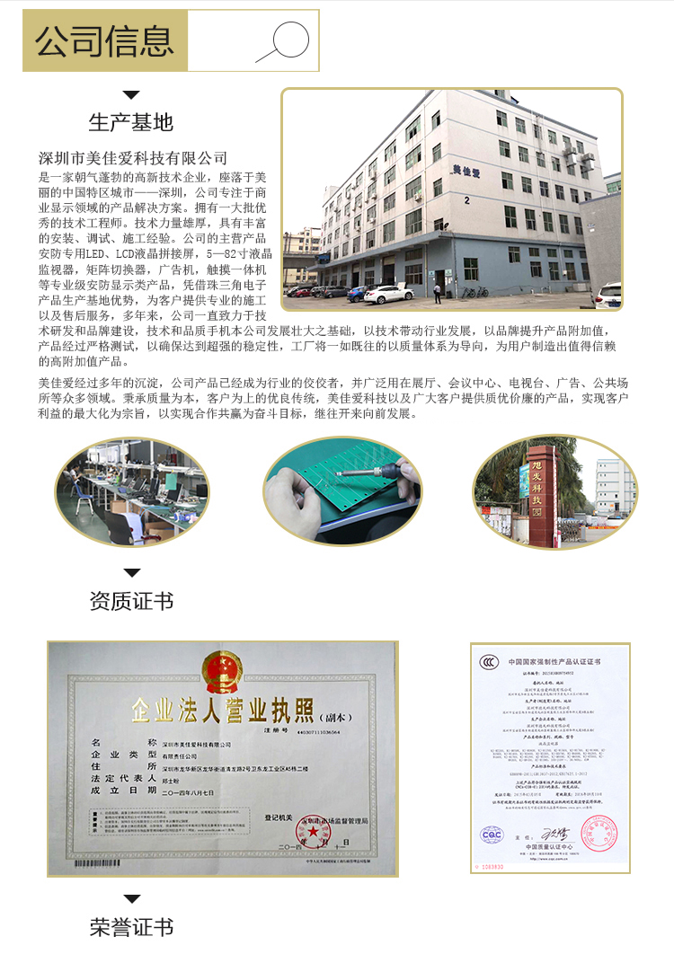 【深圳市美佳愛(ài)-液晶廣告機(jī),觸摸一體機(jī)生產(chǎn)廠家電話400-997-9971】49寸紅外觸摸一體機(jī)(安卓/壁掛)產(chǎn)品通過(guò)ISO9001_3C認(rèn)證,主營(yíng)多點(diǎn)紅外/電容式觸摸屏一體機(jī),觸控查詢一體機(jī),其他尺寸18.5寸21寸24寸27寸32寸40寸43寸46寸49寸55寸65寸75寸86寸98寸100寸多功能多媒體教學(xué)會(huì)議一體機(jī),戶外立式/壁掛雙面廣告機(jī),單機(jī)版/安卓網(wǎng)絡(luò)廣告機(jī) 豎屏樓宇電梯廣告機(jī),長(zhǎng)條型屏,工業(yè)級(jí)工控電腦觸摸顯示器,大尺寸觸摸屏查詢系統(tǒng),商顯平板電腦電視,提供報(bào)價(jià)價(jià)格,安裝施工,售后維修等
