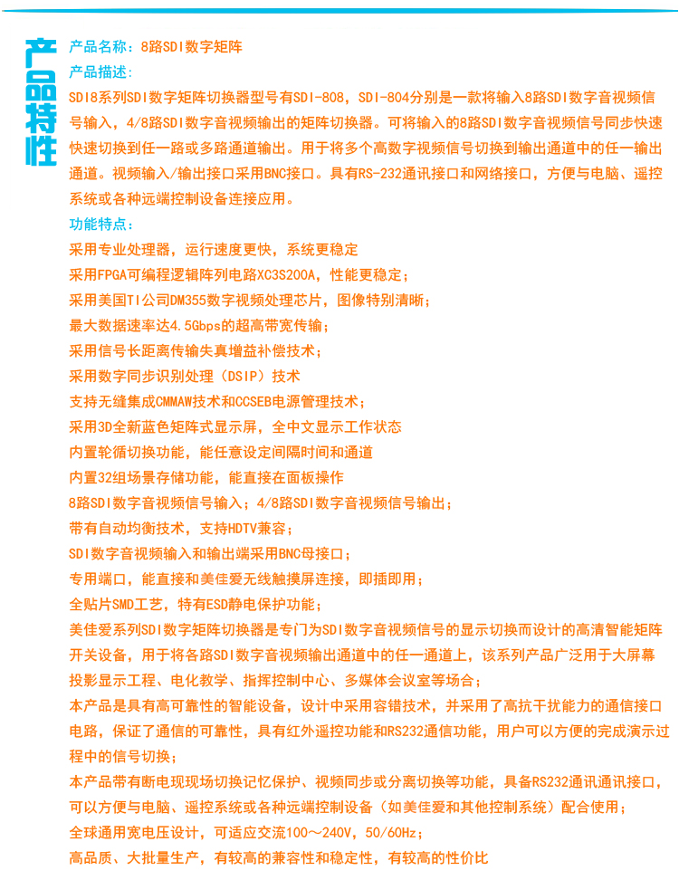 【深圳市美佳愛-矩陣切換器,視頻拼接處理器生產廠家電話400-997-9971】SDI矩陣切換器產品通過ISO9001_3C認證,型號規格有4進,8進,12進,16進,24進,32進,48進,64進,128路輸入,4出,8出,12出,16出,24出,32出,48出,64出,128路輸出,專業提供LED視頻處理器,監控音視頻矩陣切換器,DVI/SDI/RGB/HDMI/VGA混合矩陣,外置拼接處理器,視頻服務器,云處理器,液晶大屏幕處理器,視頻分配器,網絡高清數字解碼矩陣主機生產廠家,高品質,穩定性強的產品