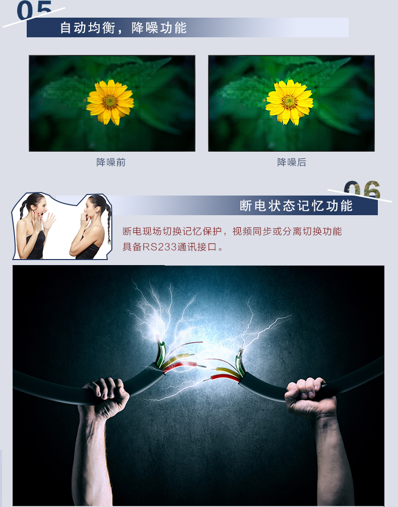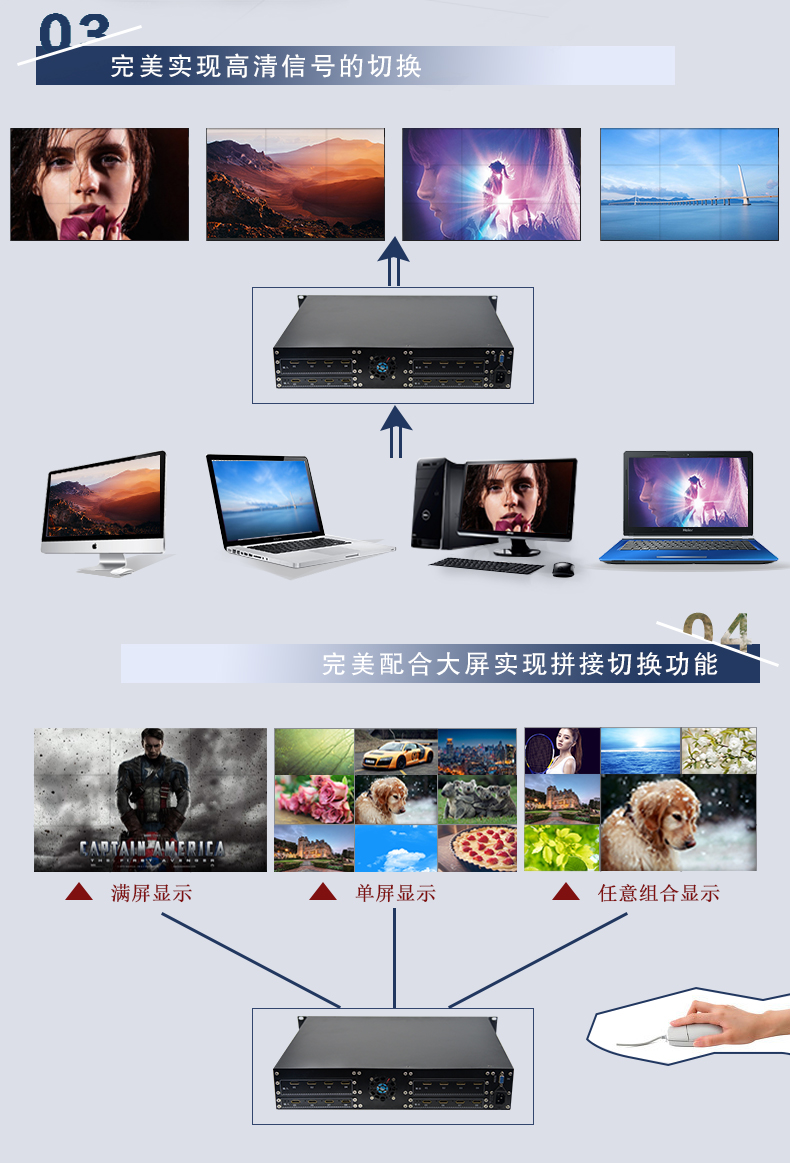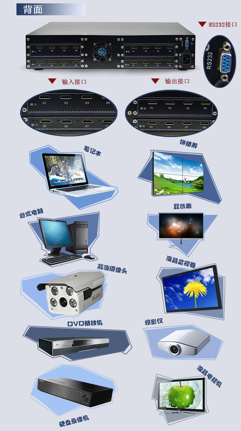 5.可拼接(選配),兼容了拼接處理器功能,支持普通電視、液晶顯示器及DLP等實(shí)現(xiàn)大屏幕拼接功能;